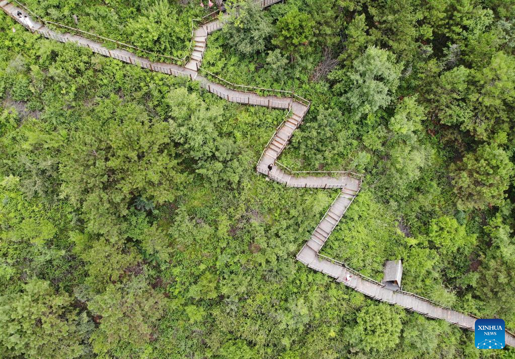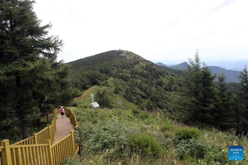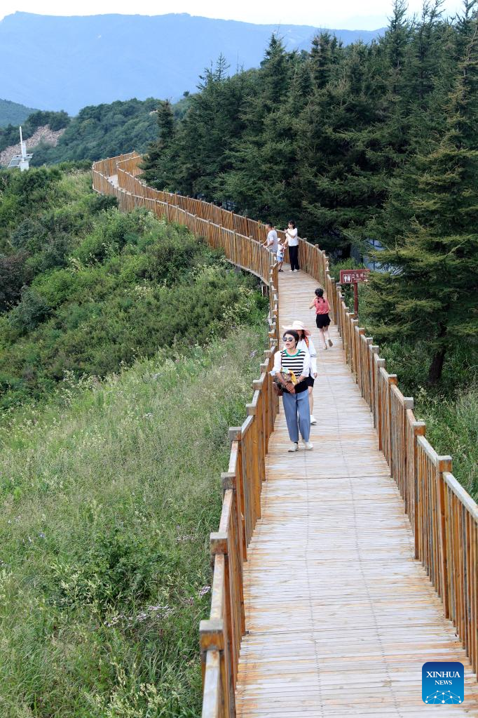 Visitors tour the Baicaowa national forest park in Luanping County of Chengde, north China's Hebei Province, Aug. 8, 2022. In recent years, local authorities of Luanping have striven to upgrade its construction of tourism infrastructure in innovative ways, thus powering its tourism development. (Xinhua/Luo Xuefeng)