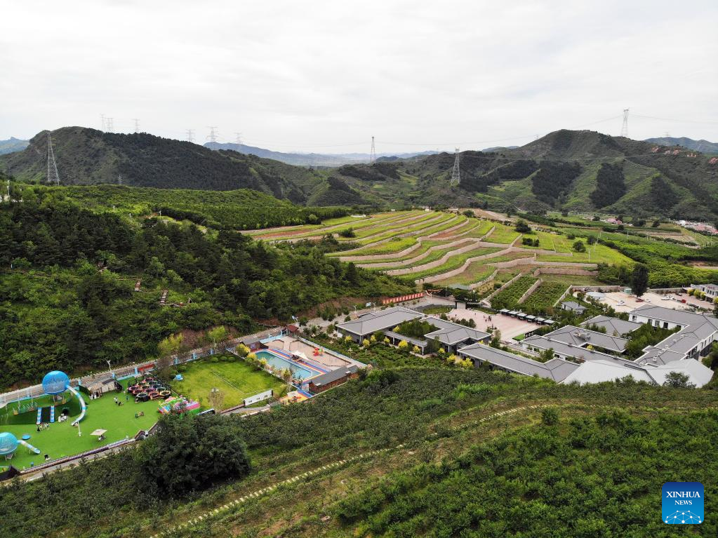 Aerial photo taken on Aug. 8, 2022 shows a scenic area themed Chinese medicine and flowers planting in Luanping County of Chengde, north China's Hebei Province. In recent years, local authorities of Luanping have striven to upgrade its construction of tourism infrastructure in innovative ways, thus powering its tourism development. (Xinhua/Luo Xuefeng)