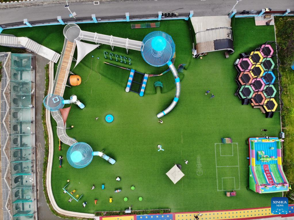 Aerial photo taken on Aug. 8, 2022 shows children having fun at a scenic area themed Chinese medicine and flowers planting in Luanping County of Chengde, north China's Hebei Province. In recent years, local authorities of Luanping have striven to upgrade its construction of tourism infrastructure in innovative ways, thus powering its tourism development. (Xinhua/Luo Xuefeng)