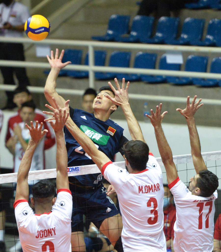 Zhang Jingyin (top) of China spikes during a 2022 AVC (Asian Volleyball Confederation) Cup match between China and Bahrain in Nakhon Pathom, Thailand, on Aug. 9, 2022. (Xinhua/Rachen Sageamsak)