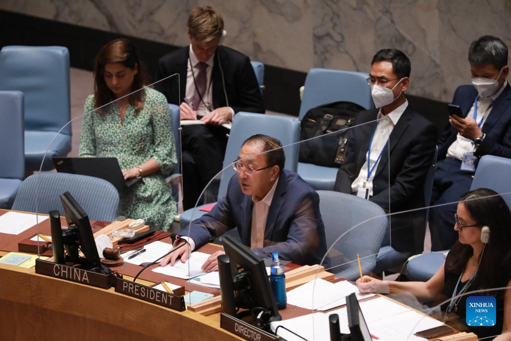 Zhang Jun (C), China's permanent representative to the United Nations, chairs an emergency opening meeting of the Security Council on the situation in the Middle East, including the Palestinian question, at the UN headquarters in New York, Aug. 8, 2022. Zhang urged the international community to take substantive steps to advance the two-state solution to settle the Palestinian issue at an early date. Monday's emergency meeting was convened at the request of China, the United Arab Emirates, France, Ireland and Norway, according to the Chinese UN mission. (Xinhua/Xie E)