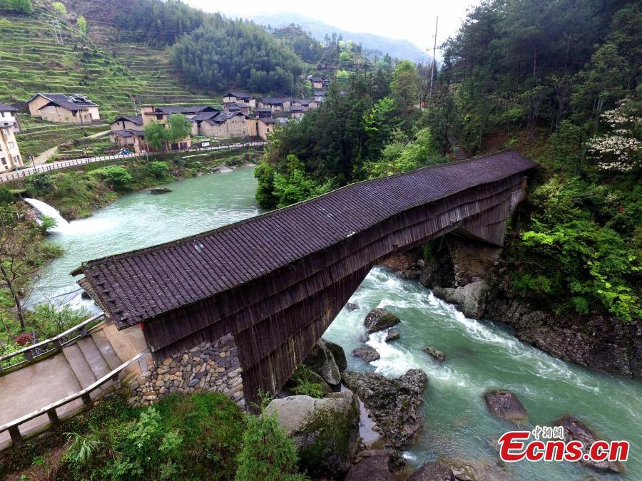 File photo shows the Luofeng wooden-roofed arch bridge in Xiadang town of Shouning county in Ningde, east China's Fujian Province. (Photo: China News Service/Wang Dongming)