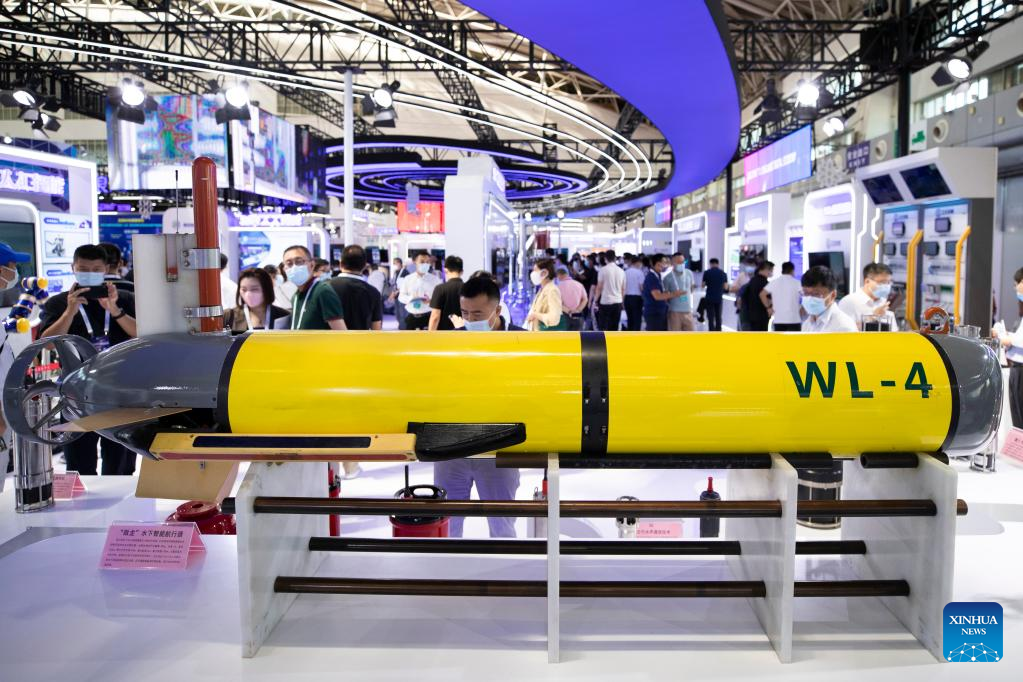 People visit the maritime equipment area of the 2022 World 5G Convention in Harbin, capital of northeast China's Heilongjiang Province, Aug. 10, 2022. The 2022 World 5G Convention kicked off here on Wednesday. (Xinhua/Zhang Tao)