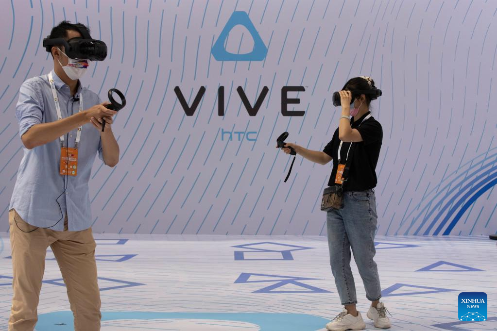 People experience VR devices supported by 5G networks at the 2022 World 5G Convention in Harbin, capital of northeast China's Heilongjiang Province, Aug. 10, 2022. The 2022 World 5G Convention kicked off here on Wednesday. (Xinhua/Zhang Tao)