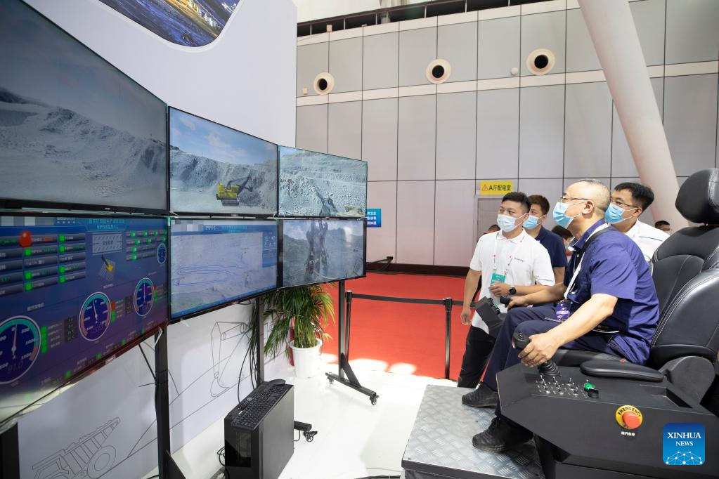 People experience the remote mining equipment supported by 5G network at the 2022 World 5G Convention in Harbin, capital of northeast China's Heilongjiang Province, Aug. 10, 2022. The 2022 World 5G Convention kicked off here on Wednesday. (Xinhua/Zhang Tao)