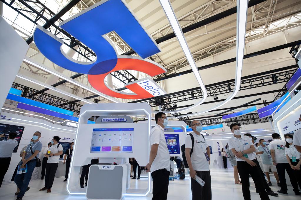 People visit the exhibition booth of China Telecom at the 2022 World 5G Convention in Harbin, capital of northeast China's Heilongjiang Province, Aug. 10, 2022. The 2022 World 5G Convention kicked off here on Wednesday. (Xinhua/Zhang Tao)