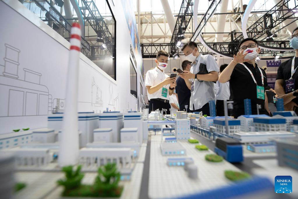 Exhibitors demonstrate the model of 5G smart petrochemical plant at an exhibition booth of the 2022 World 5G Convention in Harbin, capital of northeast China's Heilongjiang Province, Aug. 10, 2022. The 2022 World 5G Convention kicked off here on Wednesday. (Xinhua/Zhang Tao)