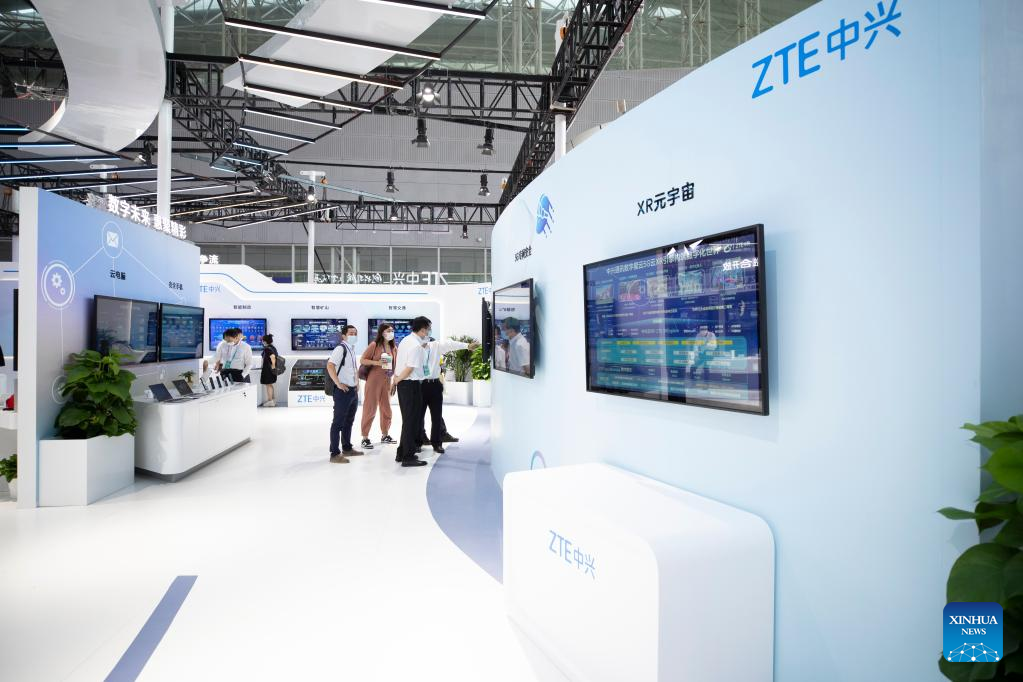 People visit the exhibition booth of ZTE at the 2022 World 5G Convention in Harbin, capital of northeast China's Heilongjiang Province, Aug. 10, 2022. The 2022 World 5G Convention kicked off here on Wednesday. (Xinhua/Zhang Tao)