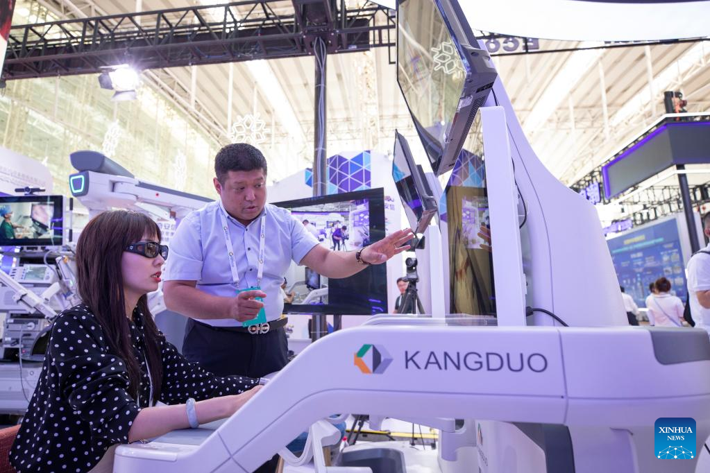 An exhibitor demonstrates the 5G remote surgery robot at an exhibition booth of the 2022 World 5G Convention in Harbin, capital of northeast China's Heilongjiang Province, Aug. 10, 2022. The 2022 World 5G Convention kicked off here on Wednesday. (Xinhua/Zhang Tao)