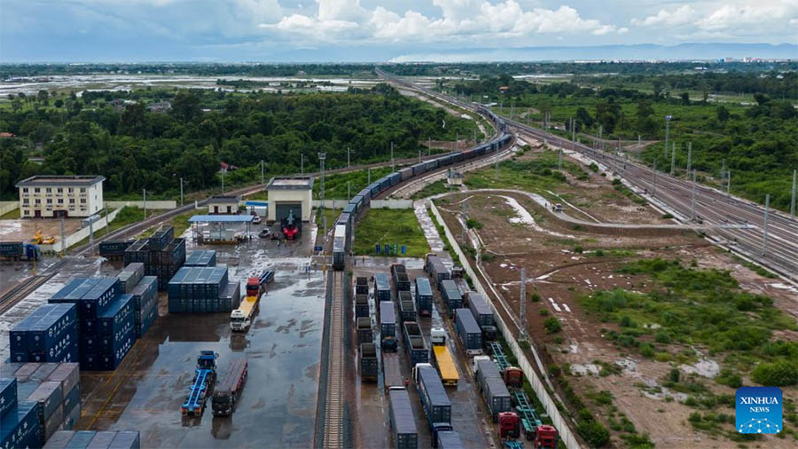Aerial photo taken on Aug. 9, 2022 shows cross-border goods being transported at Vientiane South Station of China-Laos Railway in Laos. The Laos-China Railway Co., Ltd. (LCRC), a joint venture based in Lao capital Vientiane responsible for the operation of the Railway's Lao section, told Xinhua Wednesday that since its opening last December, the cross-border goods transported by the China-Laos Railway have exceeded 1 million tons. (Photo by Kaikeo Saiyasane/Xinhua)