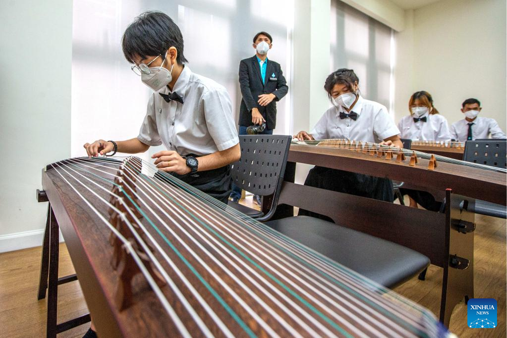 People learn to play guzheng, or Chinese zither, at China Culture Center in Bangkok, Thailand, Aug. 9, 2022. Students of Kanlayanee school watched a documentary about Sanxingdui, and experienced traditional Chinese cultural activities at China Culture Center in Bangkok. (Xinhua/Wang Teng)