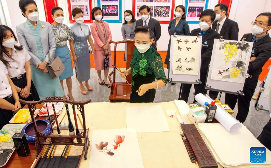 An artist (C) introduces traditional Chinese painting at China Culture Center in Bangkok, Thailand, Aug. 9, 2022. Students of Kanlayanee school watched a documentary about Sanxingdui, and experienced traditional Chinese cultural activities at China Culture Center in Bangkok. (Xinhua/Wang Teng)