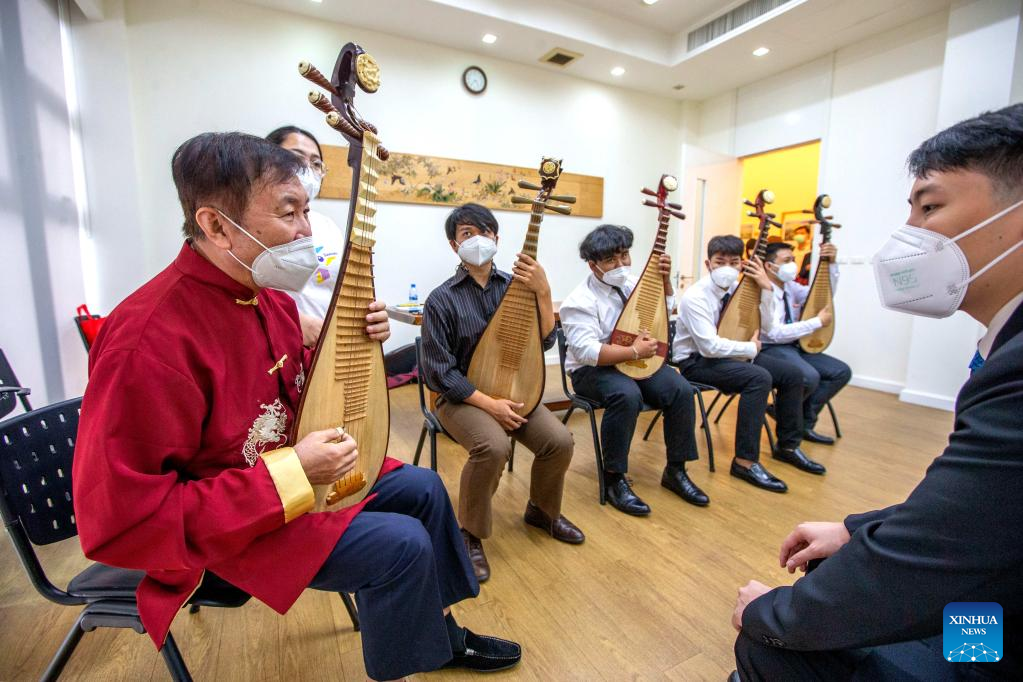 People learn to play pipa, a four-stringed Chinese lute, at China Culture Center in Bangkok, Thailand, Aug. 9, 2022. Students of Kanlayanee school watched a documentary about Sanxingdui, and experienced traditional Chinese cultural activities at China Culture Center in Bangkok. (Xinhua/Wang Teng)
