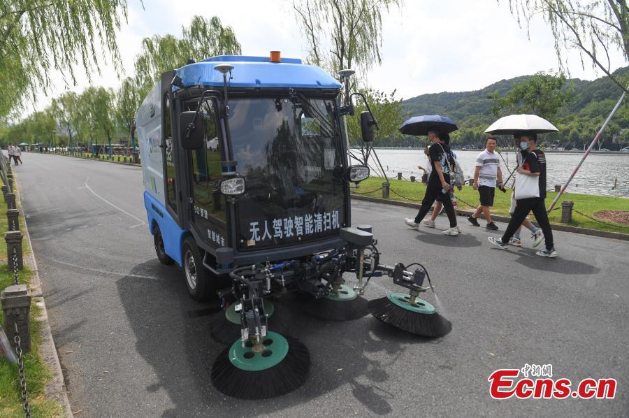 An unmanned 5G sanitation robot works at the West Lake scenic area in Hangzhou, east China's Zhejiang Province, Aug. 10, 2022. (Photo: China News Service/Wang Gang)