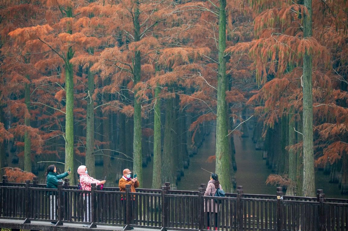 Tourists take photos in a wetland in the Zhangdu Lake, Wuhan, Central China's Hubei province, Dec. 11, 2021. (People's Daily Online/Ji Pengfei)