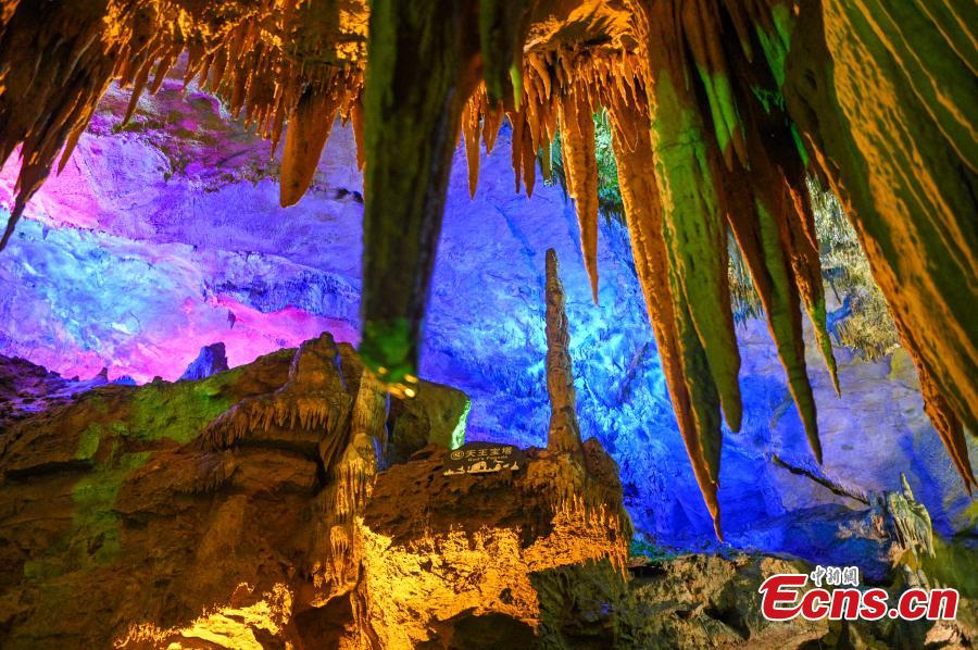 Colored lights illuminate the geological formations at the Benxi Water Cave, a large-scale underground karst, in Benxi, northeast China's Liaoning Province, Aug. 10, 2022. (Photo: China News Service/Yu Haiyang)