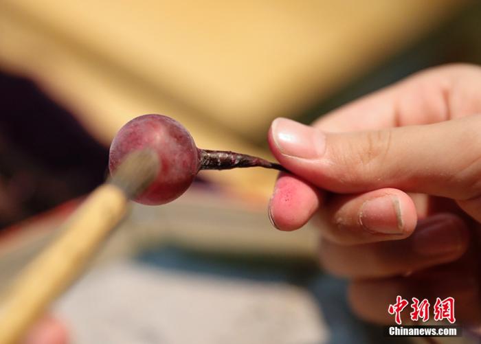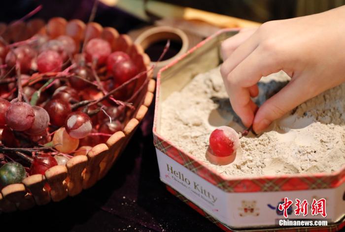 Tang Hantuoya frosts a glass grape. (Chinanews.com/Zhai Lu)