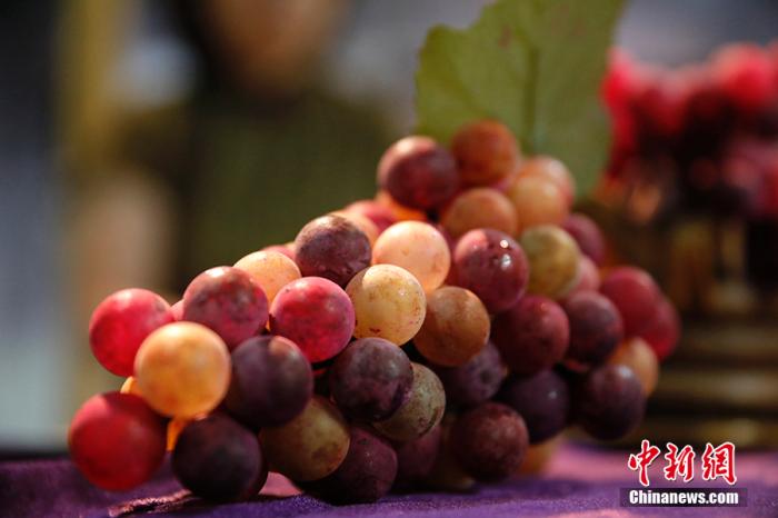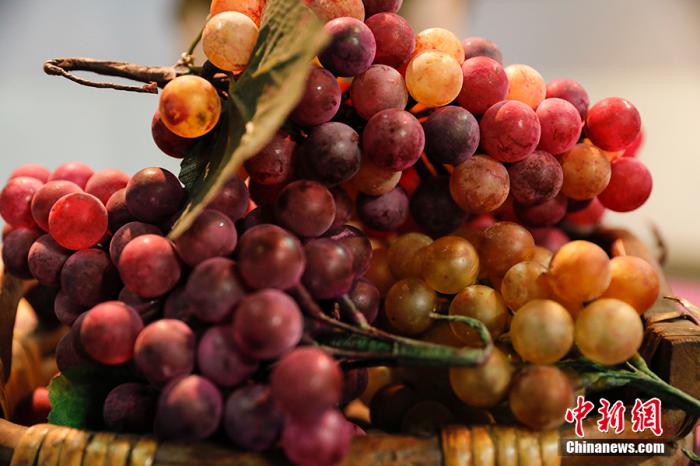 Photo shows a bunch of realistic-looking glass grapes. (Chinanews.com/Zhai Lu)
