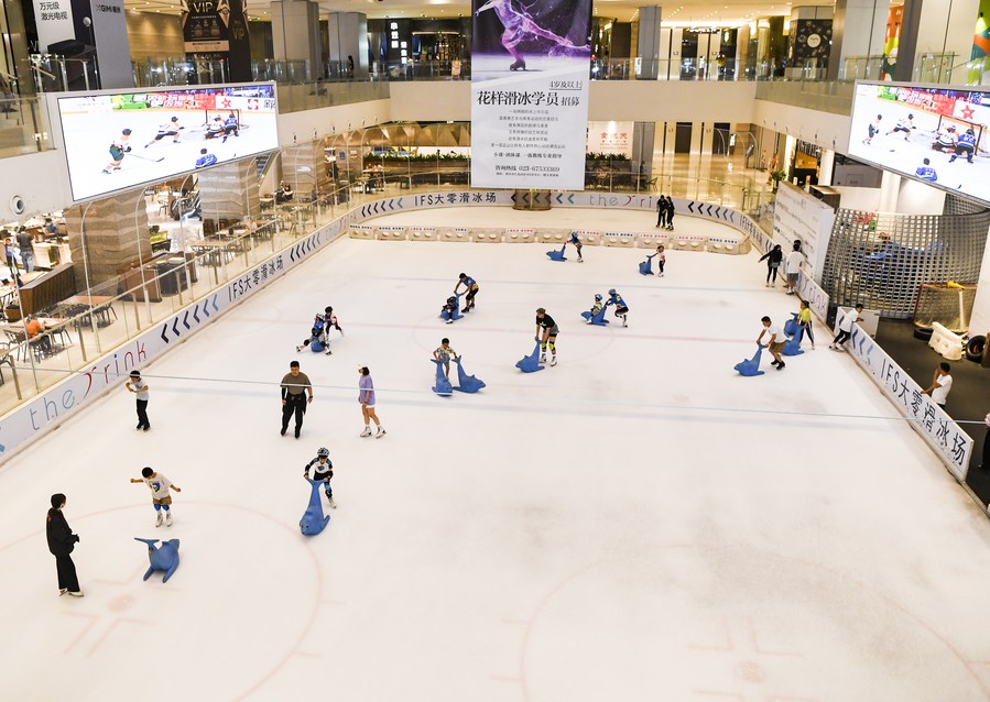 People enjoy skating at an ice rink of a shopping mall in southwest China's Chongqing Municipality, June 26, 2022. (Xinhua/Wang Quanchao)