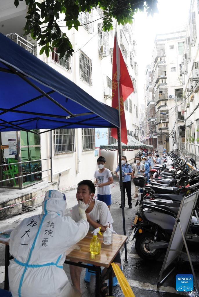 Yu Lu (R), a medical worker from central China's Hubei Province, takes a swab sample from a resident for nucleic acid testing in Sanya, south China's Hainan Province, Aug. 11, 2022.