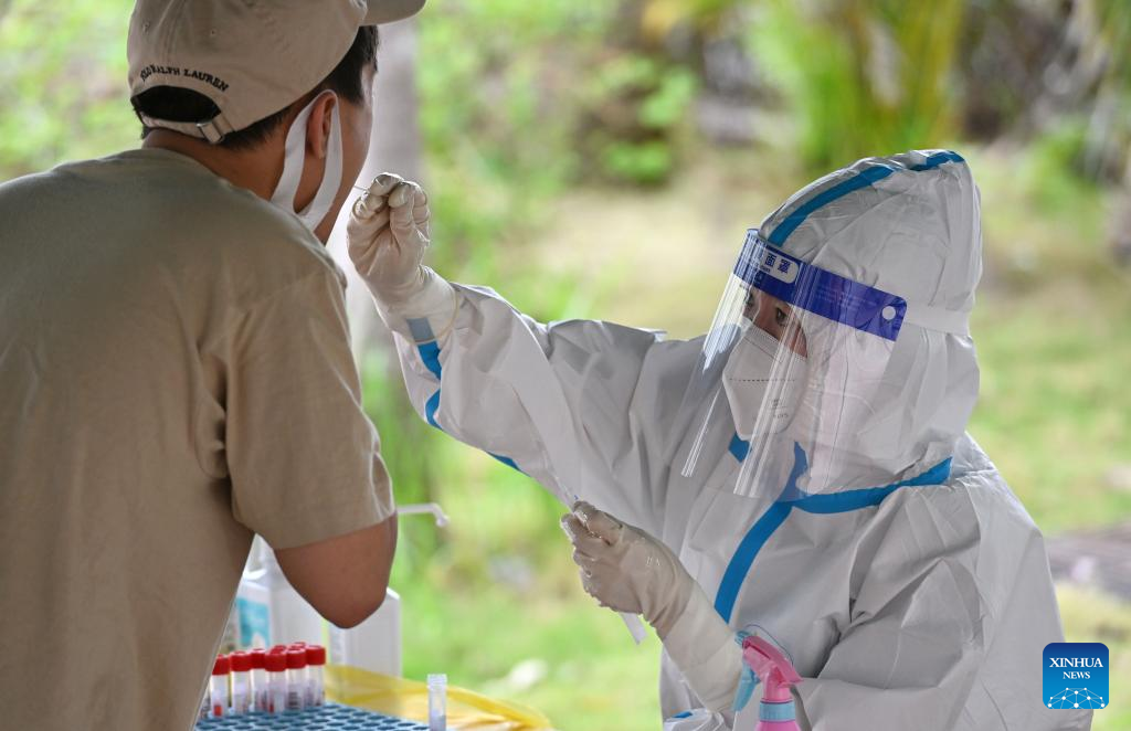 Yuan Qingyi, a medical worker from central China's Henan Province, takes a swab sample from a resident for nucleic acid testing in Sanya, south China's Hainan Province, Aug. 11, 2022.