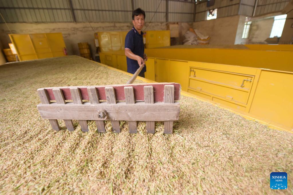 A villager dries hybrid rice seeds at a hybrid rice seed production base in Zhouping Village of Qiandongnan Miao and Dong Autonomous Prefecture, southwest China's Guizhou Province, Aug. 11, 2022. (Photo by Tang Peng/Xinhua)
