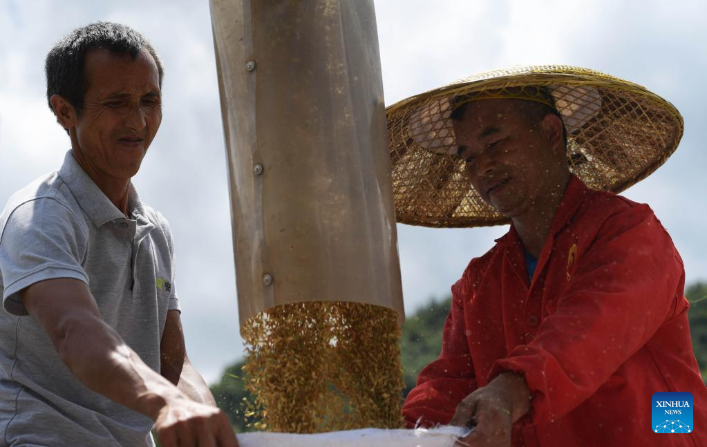 Villagers harvest hybrid rice seeds at a hybrid rice seed production base in Zhouping Village of Qiandongnan Miao and Dong Autonomous Prefecture, southwest China's Guizhou Province, Aug. 11, 2022. (Xinhua/Yang Ying)