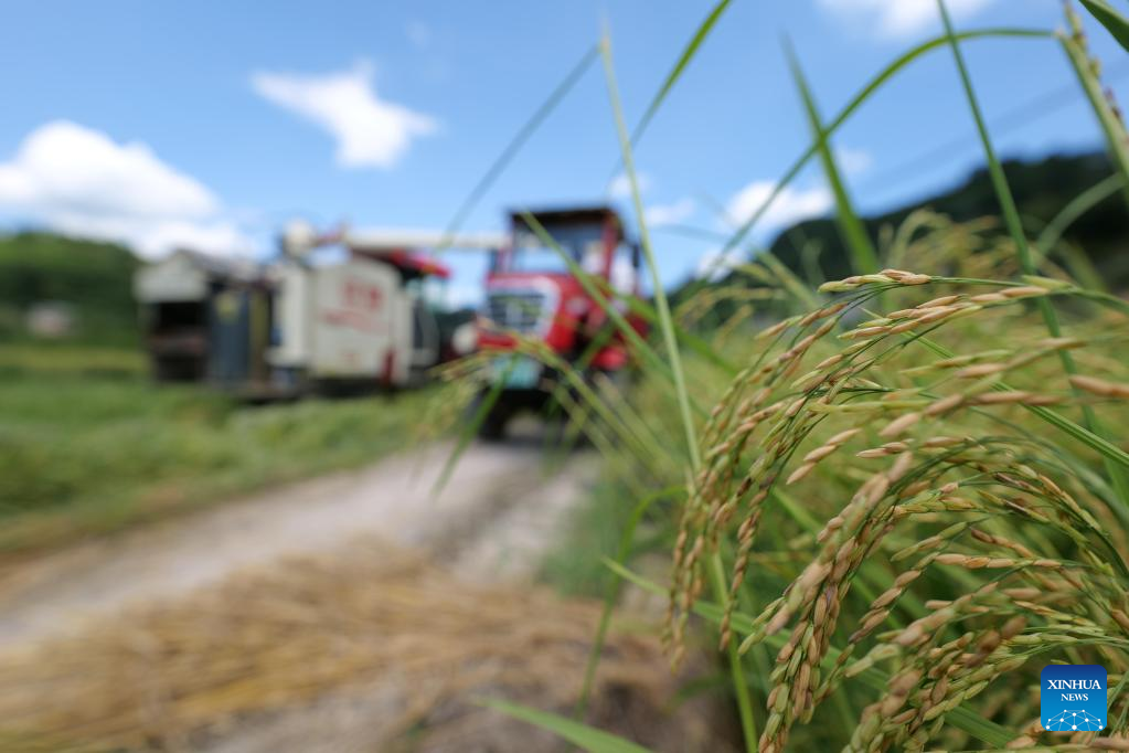 A reaper harvests hybrid rice seeds at a hybrid rice seed production base in Zhouping Village of Qiandongnan Miao and Dong Autonomous Prefecture, southwest China's Guizhou Province, Aug. 11, 2022. (Photo by Yang Yun/Xinhua)