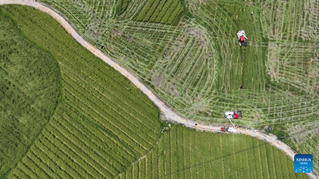 Aerial photo taken on Aug. 11, 2022 shows reapers harvesting hybrid rice seeds at a hybrid rice seed production base in Zhouping Village of Qiandongnan Miao and Dong Autonomous Prefecture, southwest China's Guizhou Province. (Xinhua/Yang Ying)