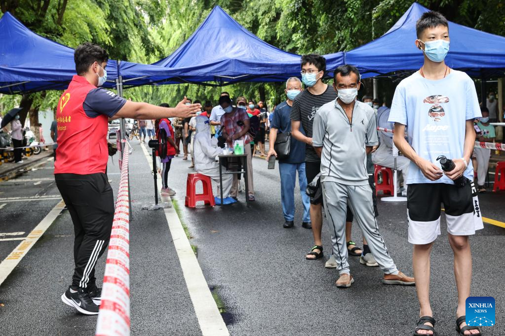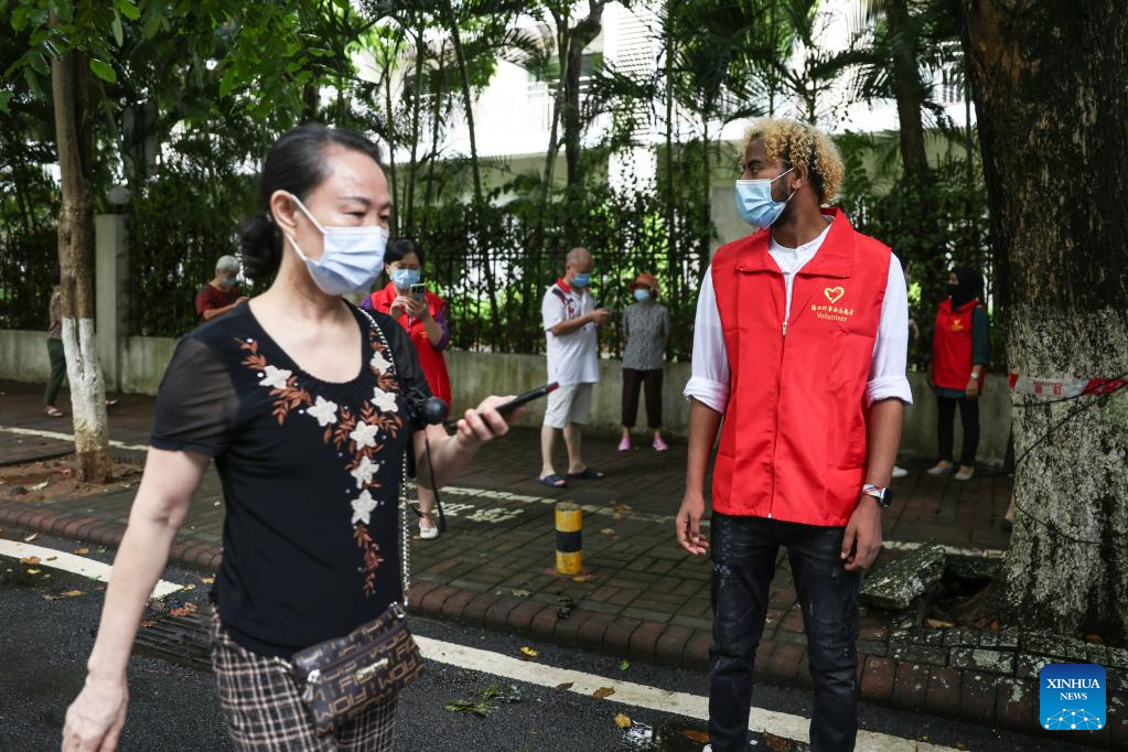 Some foreign residents have volunteered to offer services at nucleic acid sampling sites in Haikou amid the latest COVID-19 resurgence in Hainan Province. (Xinhua/Zhang Liyun)