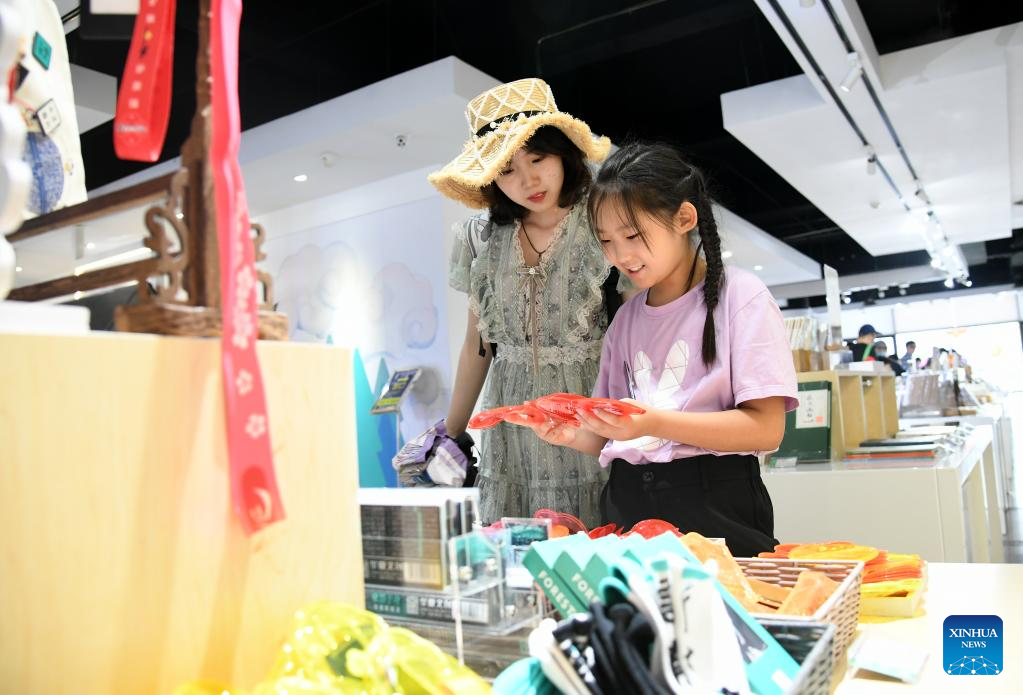 Visitors view cultural and creative products at the Shaanxi History Museum in Xi'an, northwest China's Shaanxi Province, Aug. 11, 2022.