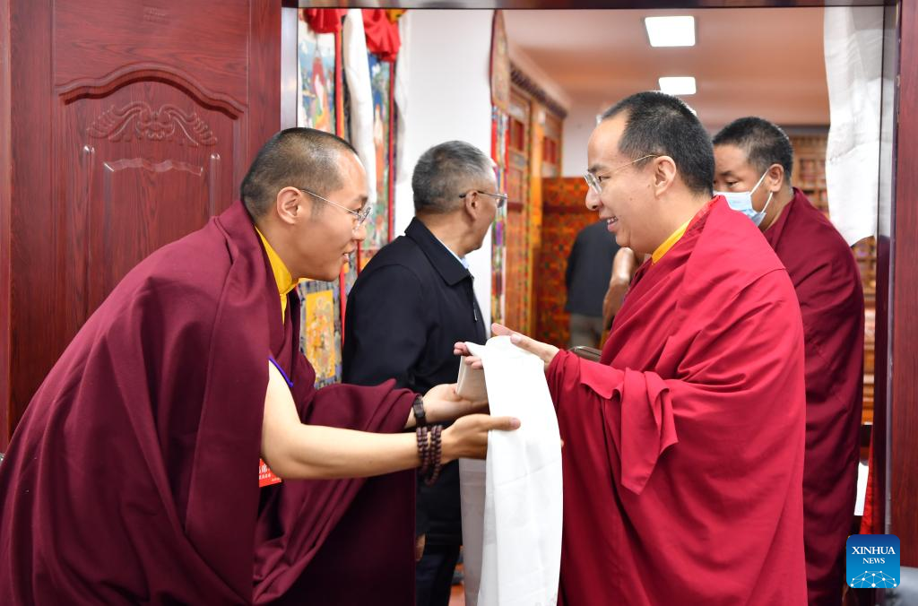A Buddhist monk presents a hada, a silk scarf used to express respect and greeting, to Panchen Erdeni Chos-kyi rGyal-po on June 2, 2022. Panchen Erdeni Chos-kyi rGyal-po had performed his daily duties as president of the Tibet branch of the Buddhist Association of China in Lhasa since mid-May. (Xinhua/Chogo)