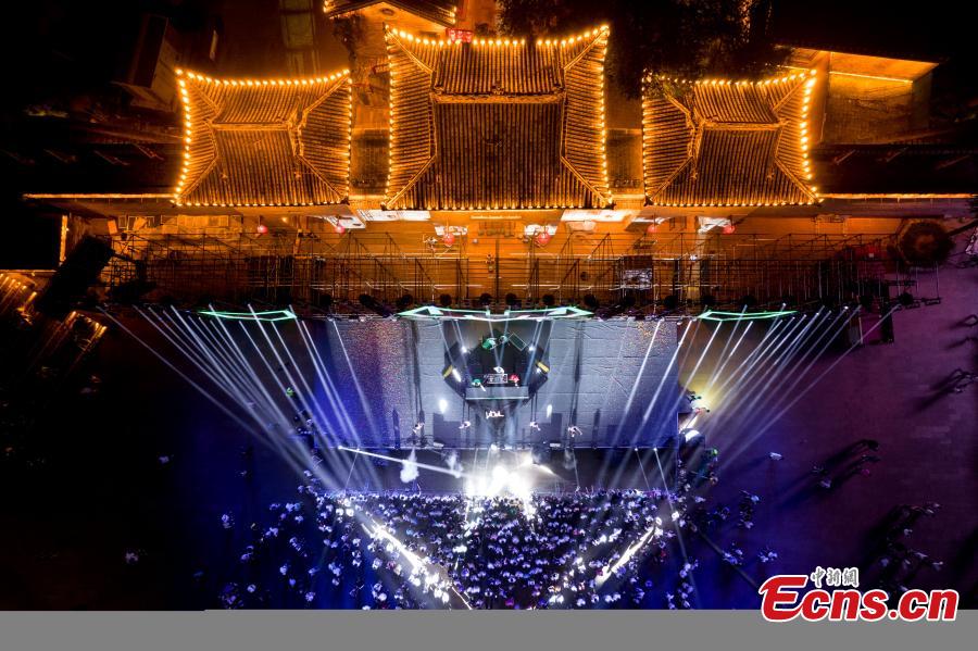 Dayang ancient town is illuminated during an electronic music festival in Zezhou county of Jincheng city, north China's Shanxi Province, Aug. 11, 2022. (Photo: China News Service/Wei Liang)