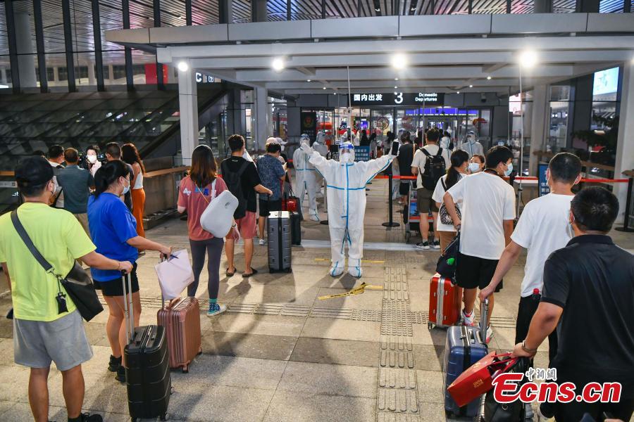 Tourists wait in line to enter the terminal building at the Haikou Meilan International Airport, south China's Hainan Province, Aug. 12, 2022. (Photo: China News Service/Luo Yunfei)
