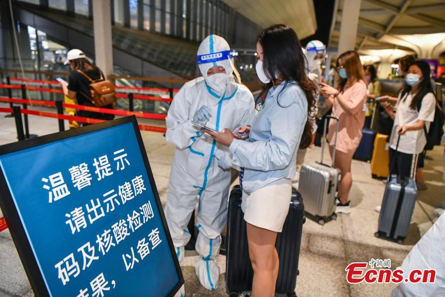 Staff members check tourists' health and nucleic acid testing information at the Haikou Meilan International Airport, south China's Hainan Province, Aug. 12, 2022. (Photo: China News Service/Luo Yunfei)