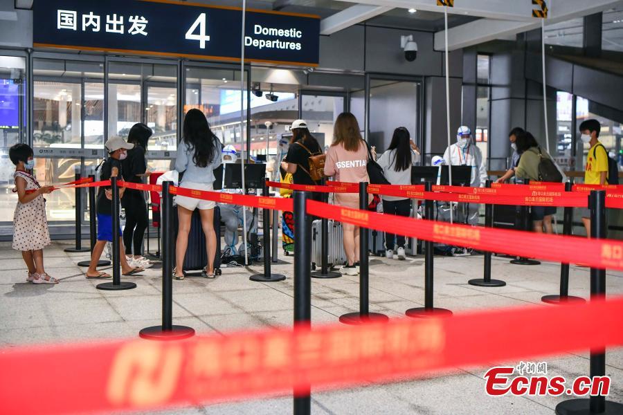 Tourists wait in line to enter the terminal building at the Haikou Meilan International Airport, south China's Hainan Province, Aug. 12, 2022. (Photo: China News Service/Luo Yunfei)