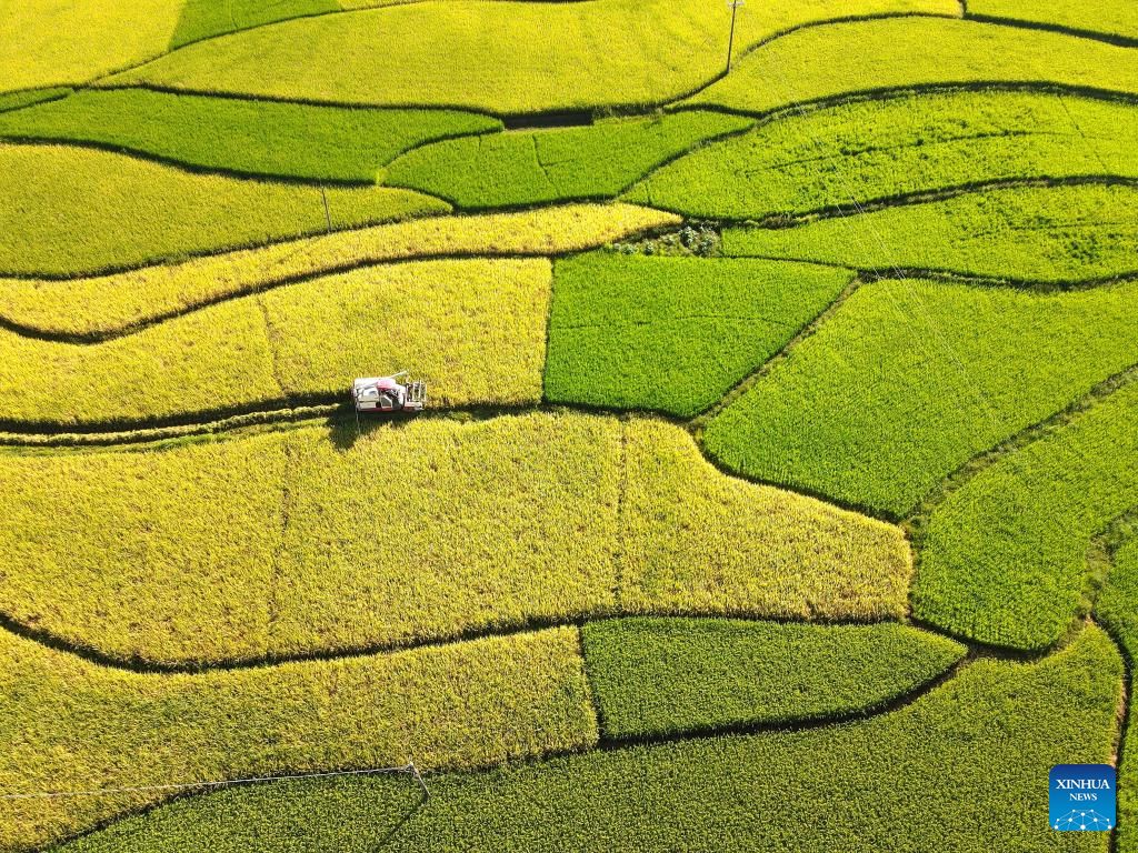 Aerial photo taken on Aug. 12, 2022 shows a reaper harvesting rice in Tongliang Village of Shuangfeng County, central China's Hunan Province. (Photo by Li Jianxin/Xinhua)