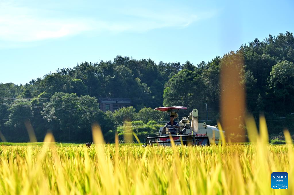 A reaper harvests rice in Tongliang Village of Shuangfeng County, central China's Hunan Province, Aug. 12, 2022. (Photo by Li Jianxin/Xinhua)