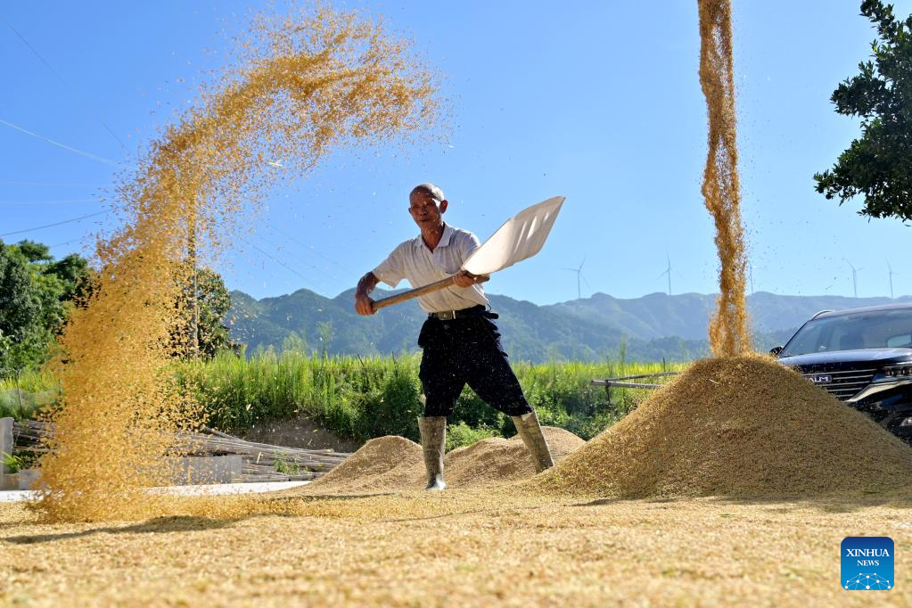 A farmer airs reaped grain in Tongliang Village of Shuangfeng County, central China's Hunan Province, Aug. 12, 2022. (Photo by Li Jianxin/Xinhua)