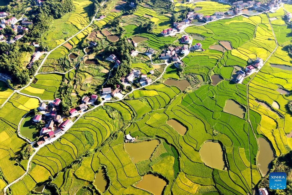 Aerial photo taken on Aug. 12, 2022 shows rice fields in Jingzi Township of Shuangfeng County, central China's Hunan Province. (Photo by Li Jianxin/Xinhua)