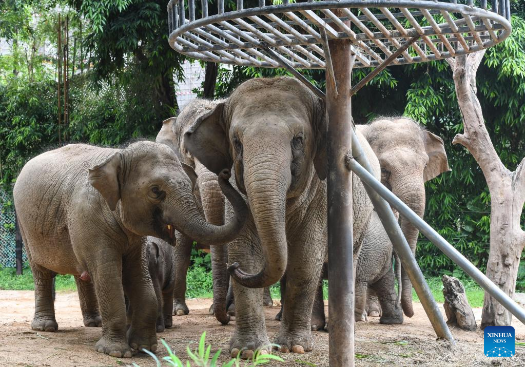 Photo taken on Aug. 12, 2022 shows Asian elephants at Chimelong Safari Park in Guangzhou, south China's Guangdong Province.