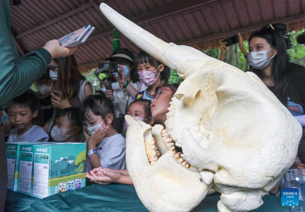 A staff member introduces the knowledge about Asian elephants to children at Chimelong Safari Park in Guangzhou, south China's Guangdong Province, Aug. 12, 2022.