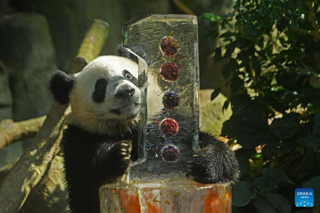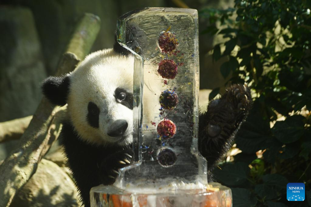 Panda cub Le Le tastes its icy birthday cake during its first birthday celebration held at Singapore's River Wonders on Aug. 12, 2022. (Photo by Then Chih Wey/Xinhua)