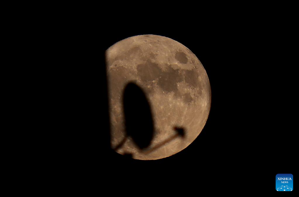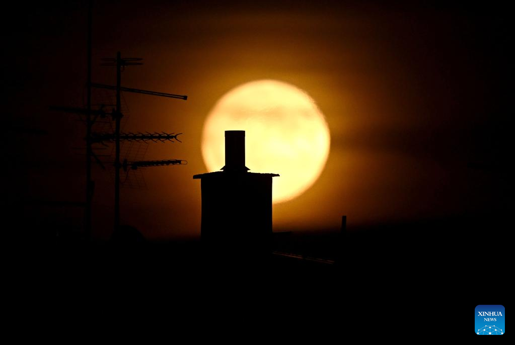 A full moon rises in the sky above Zagreb, Croatia, Aug. 11, 2022. (Photo by Marko Lukunic/PIXSELL via Xinhua)