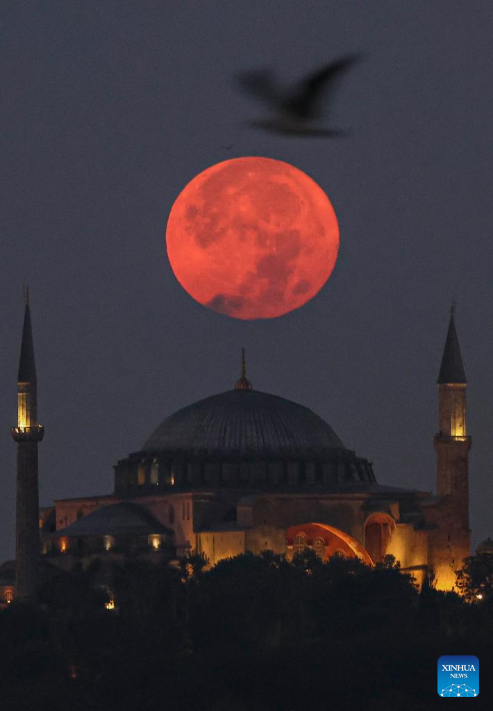 A full moon sets behind the Hagia Sophia in Istanbul, Trkiye, Aug. 12, 2022. (Photo by Unal Cam/Xinhua)