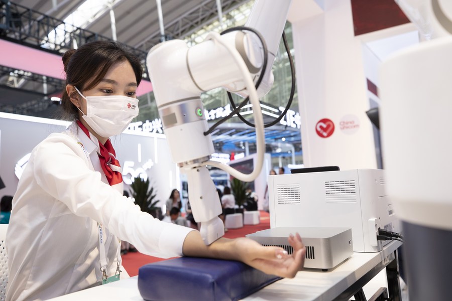 A visitor experiences a 5G remote medical robot at the 2022 World 5G Convention in Harbin, capital of northeast China's Heilongjiang Province, Aug. 10, 2022. (Xinhua/Zhang Tao)