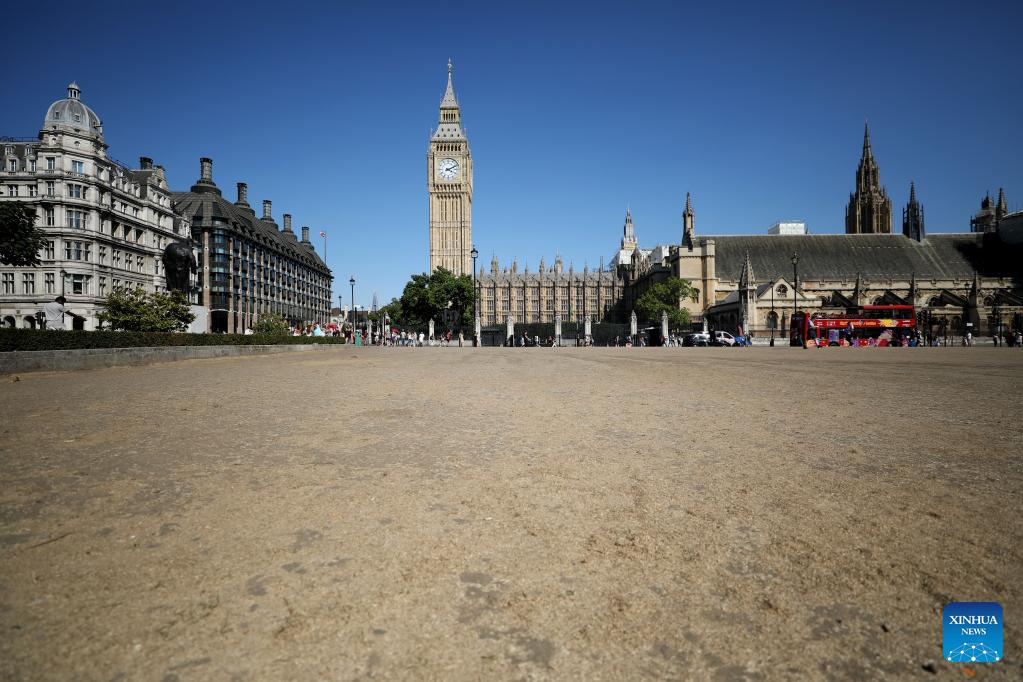 Photo taken on Aug. 13, 2022 shows a view of the lawn in Parliament Square in London, Britain. A drought was officially declared on Friday across a large swathe of England, amid a new heatwave and prolonged dry weather. (Xinhua/Li Ying)