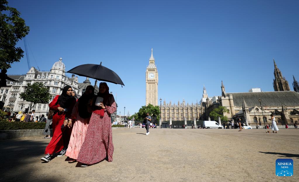 People walk on the lawn in Parliament Square in London, Britain, on Aug. 13, 2022. A drought was officially declared on Friday across a large swathe of England, amid a new heatwave and prolonged dry weather. (Xinhua/Li Ying)