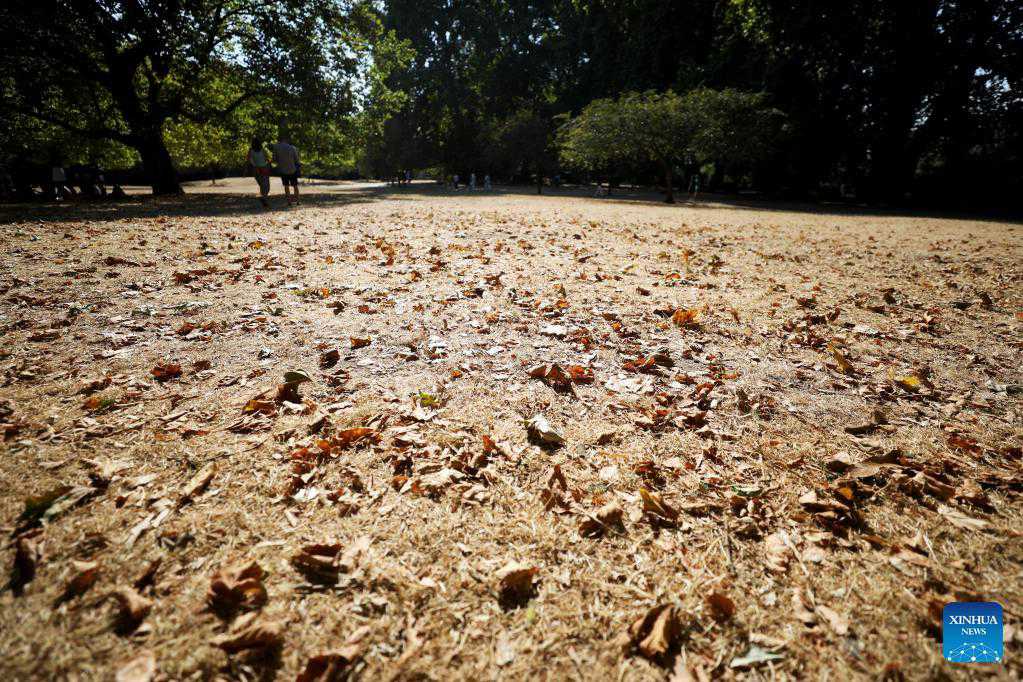 People walk on the lawn in St James's Park in London, Britain, on Aug. 13, 2022. A drought was officially declared on Friday across a large swathe of England, amid a new heatwave and prolonged dry weather. (Xinhua/Li Ying)