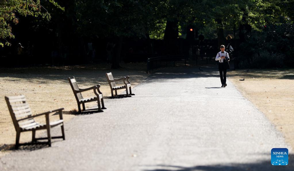 A man walks past the lawn in St James's Park in London, Britain, on Aug. 13, 2022. A drought was officially declared on Friday across a large swathe of England, amid a new heatwave and prolonged dry weather. (Xinhua/Li Ying)